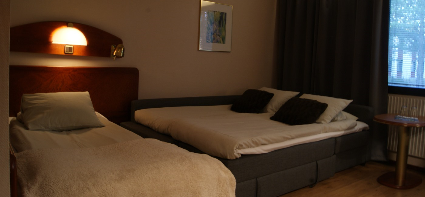 - En 90 cm bred säng och en dubbel bäddsoffa, som ni bäddar upp när det är dax att sova